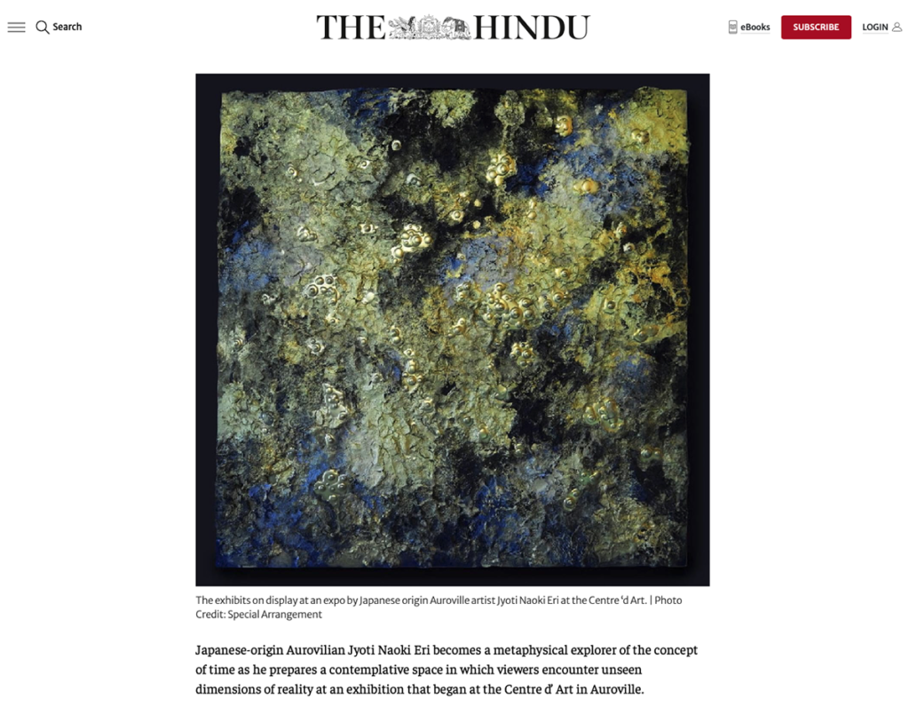 “Expo of Japanese origin artist in Auroville” Japanese-origin Aurovilian Jyoti Naoki Eri becomes a metaphysical explorer of the concept of time as he prepares a contemplative space in which viewers encounter unseen dimensions of reality at an exhibition that began at the Centre d’ Art in Auroville. “Still Here”, is part of the multidisciplinary artist’s ongoing series, “A Time Trilogy” that explores and visualises layered perceptions of time. Rooted in Eastern philosophy and informed by modern science, the works seek a meeting point between spirituality and contemporary thought. “In my artistic practice, time functions as a fundamental medium, shaping conception, process, and creation. Establishing a conscious relationship with time is essential to transforming inspiration into form,” said Mr. Eri. Time, in the physical world, is one of the few universally shared dimensions — beyond ownership or control. Spiritually, however, he experiences time as neither linear nor fixed, but as multidimensional and all-encompassing. The works which draw from Eastern landscape traditions such as “Sansui” blur the boundary between subject and background. Nature dominates the frame, while human presence is minimal or symbolic, accentuating the inner state and a spiritual dimension. For the artist, these landscapes reflect his inner states and invite the viewer into the work, rather than positioning them as a distant observer. This approach is central to Archaeology of Transcending Light (A.O.T.L.), in which he reimagines landscape through contemporary abstraction, inspired by introspection and an inward process of concentration. In this sense, the act of discovering the self feels like an archaeological excavation — as if uncovering ancient treasures, “where past and future appear fluid and, ultimately, interchangeable”. The Japanese concept of “Ma”, or the space between, deeply informs the artistic engagement. “I understand Ma as a realm where duality comes to rest, where silence, space, and subtle perception allow meaning to emerge. In Tibet, the intermediate state between life and death is called Bardo — a realm in which different forms of life force are encountered and engaged. I find these cultural connections deeply resonant,” said Mr. Eri. In his upcoming exhibition, Jyoti plans to showcase around 30 – 40 pieces of his recent paintings alongside recent ceramic works, several sound art installations featuring handcrafted speakers he designed and built. These sound installations focus on atmosphere, frequency, and silence rather than structure, inviting deep listening and introspection. The exhibition will also include related events, such as a sound bath experience, a Japanese tea ceremony, and an artist’s talk with a slideshow. The expo is on till March 11 (Tuesday to Friday 2 p.m. to 5.30 p.m.; Saturday 10 a.m. to 12.30 p.m. and 2 p.m. to 5.30 p.m.).